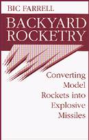 | Backyard Rocketry | BACKYARD ROCKETRY Converting Model Rockets into Explosive Missiles by Bic Farrell. By modifying and adapting the engines and rockets on hobby shop model rocket kits, it's possible to create short- and medium-range surface-to-surface and surface-to-air missiles for some serious fun! Everything you need to know is here: principles of operation, safety precautions and improvised warhead and missile designs, all illustrated with clear diagrams. Failure to strictly follow industry standards for experimentation and design can be dangerous. Therefore, this book is for academic study only! 5 1/2 x 8 1/2, softcover, illus., 72 pp.