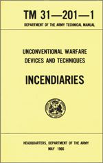| Unconventional Waref. Incendiaries TM 31-201-1 | UNCONVENTIONAL WARFARE DEVICES AND TECHNIQUES - INCENDIARIES. 5.5"x8.5" Department of the Army technical manual TM31-201-1 designed for use by U.S. Special Forces. 155 page manual covers all aspects of incendiary systems including the incendiary devices, means for igniting them, techniques for their use, methods of improvising them and sources of material supply. Written for U.S. Army Special Forces to be used in the field. Chapters on incendiary systems tools and techniques, initiators, fuse cord, improvised string fuse and others. Ignites sugar-chlorate fire fudge subigniter for thermite and many others. Chapters on incendiary materials napalm (Improvised) paraffin sawdust, fire bottles and much more. Unconventional Warfare Devices - Incendiaries, TM 31-201-1