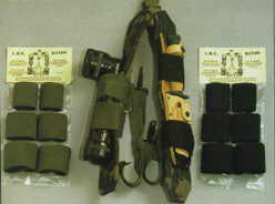 UM-84 Hip Exender Hängt das UM-84 auf den oberen Teil des Oberschenkels. Wird von Frontoffizieren benutzt und überall da wo ein Hüftholster stört. (Splitterweste.) Im oberen Teil des Holster können die Mag.-Taschen montiert werden.
