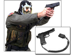 Entreiss Schutz für die Dienstwaffe. Gummi ummanteltes Stahlkabel, gerollt ähnlich einer Tel. Schnur. Länge: 50cm, dehnbar bis ca. 100-110cm. Duty Gurtbefestigung, Befestigung an der Waffe mittels Fallschirmleine. Reissfestigkeit 100 kg (Fallschirmleine)