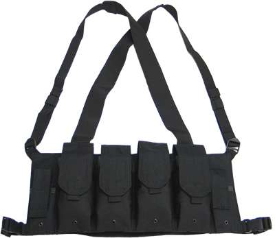 Chest Pouch Magazinträger auf Brust ca. 450 Gr. Die Plattform wird mittels gekreuzten 5 cm breiten Schultergurten auf Brusthöhe getragen, verstellbar, und mit einem ebenfalls verstelbaren Hüftgurt mit Fastexschnalle in der Hüfte Fixiert. An beiden Aussenseiten befindet sich eine Magazintasche für je 1 Pistolen Mag. Alle Taschen werden mit einem Klett-Deckel einzeln abgedeckt, grosser Verstellbereich. Drainage-Oesen in jeder Tasche. Lieferbar in schwarz oder in woodland. 4 Taschen für je 2 M-16/ CH-90er Magazine à 20 Patronen.