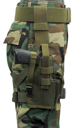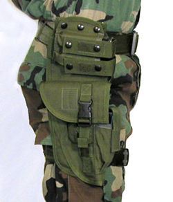 Taktisches Oberschenkelholster mit aufgesetzter Magazintasche. Durch das Sicherungsband mit Druckknopf kann die Waffe Blitzschnell gezogen werden. Dieses Sicherungsband wird wiederum durch ein Klettband gesichert, welches erst kurz vor dem Einsatz geöffnet wird. Dadurch wird verhindert, das der Druckknof im Einsatz unbeabsichtigt aufspringt. Diese Airborne Ausführung verfügt zusätzlich über ein weiteres Sicherungsband über das Griffstück, welches bei Wasser- oder Baumlandungen das herausreissen der Waffe verhindert. Am Boden wird dies geöffnet und kann hinter die Waffe gelegt werden. Passend für folgende Waffen: SIG-226,228, Sigma Glock 17,19,22,23,27, Ausführung rechts ab Lager, Linkshänder auf Bestellung.