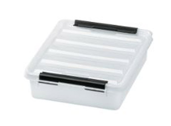 1 Liter Inhalt 21x17x6cm gross, Transparent und Stirnseitig mit Spannverschluss.