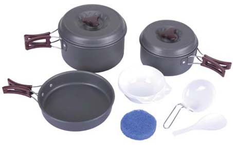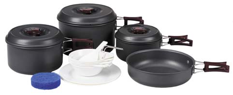 4 Pfannen Set mit 3* Deckel 1 Topf 195x130 1 Topf 175x108 jedes Teil mit isolierten Klappgriffen. 1 Topf 150x82 1 Bratpfanne 195x50 2 Plastikteller 5 Plastikschällchen 1 Plastikschöpflöffel 1 Plastiklöffel 1 Reinigungsschwamm 1 Tragebeutel
