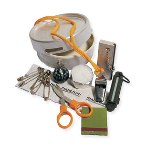 Signalpfeife mit Kordel Magnesium Feuerstarter Rechaud Kerzli Faltbare Nagelschere Briefli Zündhölzer Kompass Sicherheitsnadeln Alkoholtupfer Schleifstein