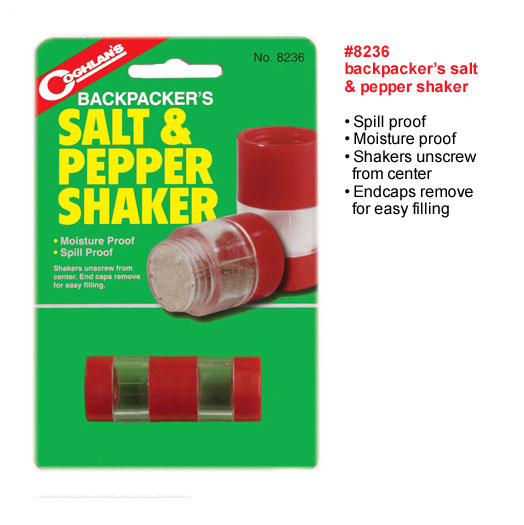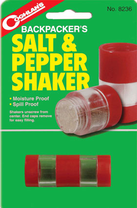 Doppelte Gewürzstreu Dose für 2 Gewürze. Meist Salz und Pfeffer. Schraubdeckel, kein aufplatzen im Gepäck wenn's mal drückt. Kann zum einfachen füllen auseinander geschraubt und auch separat verwendet werden. Klein, leicht, praktisch und tauglich.