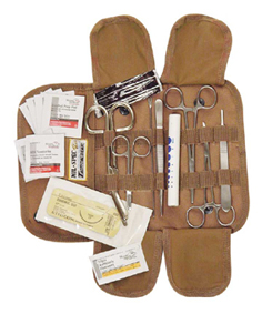 Notfallbesteck für Sanitäter. Falttasche mit Pinzetten, Scheren, Klemmen, Skalpell, Nahtmaterial, Lämpchen und Alkoholtupfer. Kann individuell aufgerüstet werden. Cordura Tasche mit Molle Bänderung.