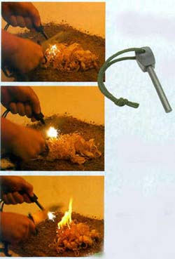 mit Feuerstein. Zum feuermachen wird mit dem Messer eine kleine Menge Späne abgekratzt und durch Funkenschlag vom Feuerstein entzündet. So kann mit wenig Übung fast überall ein Feuer entzündet werden. Gehört seit Jahren zur Überlebensausrüstung der US-AIR-FORCE und anderen Einheiten. Sehr geringes Gewicht. Sehr ergiebig. Temp. 5400 Fahrenheit = 2982 C daher kein Spielzeug.