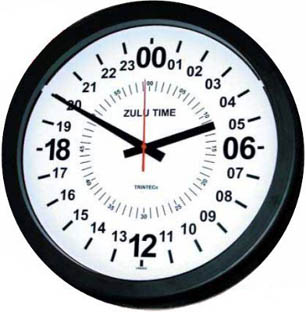 | Military Time Clock | Military Time Clock. Die Uhr für die Kriegszeit. Mit 24 h Zifferblatt. Batteriebe-triebenes Quarzlaufwerk und entspiegeltes Kristallglas. Durchmesser: 35,5 cm Genauigkeit ½ Sek/24h. Diese Uhr hängt überall da wo eine genaue Zeitliche Übereinstimmung von äusserster Wichtigkeit ist. In Bunkern mit 24 Std. Dienst verliert man nach einiger Zeit die Orientierung über Tag oder Nacht.