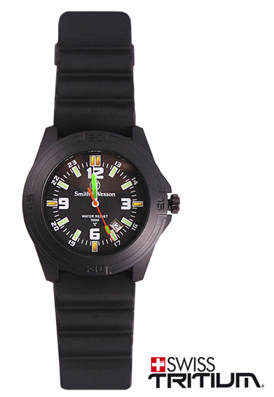 | S&W Soldiers Watch Tritium | Wasserdicht bis 100 Meter Japan Quarz Werk Schlagfest Stainless Boden 4-Fach verschraubt. Kratzfestes Saphir Glas. 7 Tritium H3 Leuchtquellen von MB Microtec Schwarzes Zifferblatt mit Datum und weichem Gummi Armband. 10 Jahre Garantie auf Leuchtquellen Geliefert mit Display Ständer.