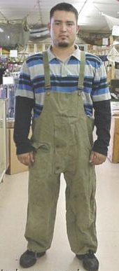 Zippered fly opening Elastic waist with provisions for suspenders Nylon reinforced knees Full-length side-zipper openings.