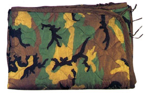 Steppdecke mit Hohlfaserfüllung, 100% DuPont Polyester daher sehr leicht, warm und Nässeunempfindlich, wird mittels Bänder in den Poncho geschnürt und isoliert. Dient zusammen mit dem Poncho als Notschlafsack. Woodland.