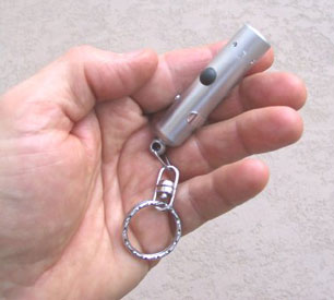 Die Stablampe für den Schlüsselbund. LED-Leuchtquelle weiss betrieben mit 3 St. Mini-Knopfzellen. Gesammtlänge nur 4.5 cm, Durchmesser: 10mm.Die LED-Diode ist durch den Lampenkopf aus Alu geschützt. Endkappe mit Gummidichtung und Schlüsselring. Mini-Mini-Mini Ding mit extremer Lichtleistung. Material: Flugzeug Alu aus dem vollen gedreht. Am Schlüsselbund oder am Reissverschluss der Jacke ist das Ding immer zur Hand. Leuchtweite 6-8 Meter