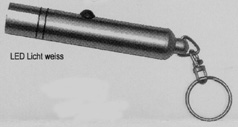 Die Stablampe für den Schlüsselbund. LED-Leuchtquelle weiss betrieben mit 4 St. Mini-Knopfzellen. Gesammtlänge 8 cm, Durchmesser: 14mm.Endkappe mit Gummidichtung und Schlüsselring. Mini-Mini-Ding mit extremer Lichtleistung. Material: Flugzeug-Alu aus dem vollen gedreht, daher extrem robust Die Leuchdiode ist durch eine geschliffene Glaslinse geschützt, was ein klaren kreisrunden schattenfreien Lichtkegel ergibt. Am Schlüsselbund oder am Reissverschluss der Jacke ist das Ding immer zur Hand. Leuchtweite 15 - 20 Meter