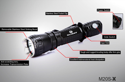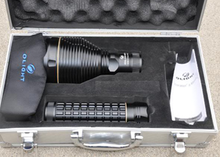 Komplett Einsatzbereit im Koffer. 1x Olight M30 Triton CREE MC-E LED 1x Verlängerungsstück für den Betrieb mit 2x 18650 Li-Ionen Akkus 1x Diffusor 1x Batterie-Magazin (für 3x CR123) 1x Tragschlaufe