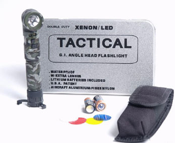 Neuste Generation der U.S. Winkellampe aus ALU wie in dieser High-Tech Zeit üblich. Xenon Brenner mit 65 Lumen Ausgangsleistung = wie SUREFIRE 6P Dazu 2 weisse LED für Nahdistanz. Z.B. im Camp in Gebäuden,zum Kartenlesen und alles wo keine Blendwirkung verlangt wird. Mittels Clip ansteckbar an Koppel, Koppeltrage usw. Zusätzlich mit Standbeinen zum aufstellen, z.B. bei Besprechungen in der Unterkunft. Betrieb mit CR-123 Batterien. Zusammen mit Molle- Tasche, Batterien und 3 Farb u 1 Schutzlinsen wie auf Bild.