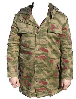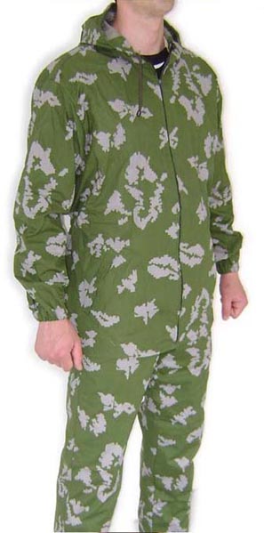 Leichter Ueberzieh Tarnanzug wie er nur an Sniper der Speznatz abgegeben wurde. Jacke mit Kaputze. Die Anzüge sind fabrikneu und stammen aus Littauen u Lettland wo kurz vor der Unabhängigkeit nicht klar war ob es ohne bewaffneten Konflikt abläuft. Während dieser Zeit gab es erhebliche Unterwanderung durch die Spetznatz in zivil. Der Rückzug war derart überstürzt das Teile der angelegten Depots vergessen wurden.