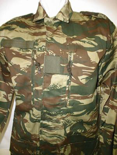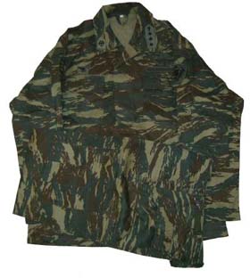 Tarnanzug der Grichischen Spezial-Einheiten. Poly/Co Grün, Braun, Schwarz gestreift, ähnlich U.S. Tiger-Stripe. Hose u. Jacke.