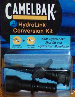 Camelbak Hydrolink Conversion Kit. Kit includes both the HydroLock Shut-Off and the HydroLink Bite Valve Adapter with Big Bite Valve. Camelbak hose Inside Diameter 1/4 inch Adapter Outside Diameter .329 inches Color black