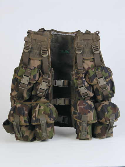 | CCG Assault Vest Schweiz | Swiss Tarn Ausrüstung | Die CCG/Per-Tec Weste ist einteilig ausgeführt, d.h. Vorder- und Rückenteil sind fest miteinander verbunden. Verschlossen wird die Weste mittels 3 einstellbaren Fastex-Verschlüssen. Material: Beschichtetes Cordura-Nylon in CH Tarn und InfraRot gehärtet. Magazintaschen: Die Doppelmagazintaschen nehmen jeweils folgende Magazine auf: je 2 St. Stgw. 90er Mag., à 30 Schuss natürlich mit Mag-pulls. Oder 2 St. Stgw. 57/GP11 oder 3 Stück NATO STANAG 5.56x45mm, 2 Stück H&K G36 5.56x45mm, 2 Stück H&K G3 7.62x51mm Die Taschen haben zwei Verschlüsse: Fastex-Verschluss und umlegbares Klettband. An der Seite jeder Tasche befindet sich eine Nylongurtbandschlaufe, an der Granaten angebracht werden können oder mit zur Hilfename eines weiteren Gurtbandes zur Fixierung der Magazine die Taschen zusammengezogen werden können. Hinter jeder Magazintasche ist ein weiteres Einschubfach, in das der Magazin-taschendeckel quasi nach hinten versenkt werden kann . (Um so z.B. bei einem taktischen Einsatz sofortigen Zugriff auf die Magazine zu erlangen.) Dieses Einschubfach ist mit Klett geschlossen um z.B. Eindringen von Sand usw. zu Verhindern. Im Brustbereich befinden sich jeweils ein Mehrzwecktasche und eine Hand-granatentasche. Im Bereich Seite und Rücken sind Befestigungsbänder für das US-MOLLE System oder Taschen für das neue IdZ-System. Mitgeliefert werden: 2 St. Mehrzwecktaschen. Für Schutzmaske, Feldflasche, Notration oder weitere Kampfmittel. Diese Taschen können an der Bebänderung angebracht werden. Am Rücken befindet sich eine eingearbeitete Tasche für eine Trinkblase à la Camelbak®. Hinter dieser Tasche befindet sich eine weitere Tasche, die mittels Klettverschluss verschlossen werden kann. Die angenähten Reisverschlüsse dienen der Befestigung von Zusatztaschen (z.b. Rucksackseitentaschen von Berghaus).
