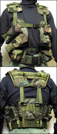 Verbesserte LBE Veste mit schräg aufgesetzten Mag. Taschen für den schnelleren Zugriff. Für insgesamt 8 Magazine und 2 Handgranaten. Befestigungspunkte für Aliceclips und Dutybefestigung. Metall D-Ringe für Buttpack. Sehr breite und gut gepolsterte Schulterteile. Fastexschnallen, Drainageöesen u. Rettungsgriff usw. eben von BlackHawk.