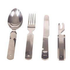 Vierteiliges Edelstahl, Chromstahl Besteck. Zusammensteckbar. Messer, Gabel, Löffel und Grosser Büchsenöffner. Jdeal für den Feldgebrauch. Somit bleibt das offizielle immer sauber und Inspektionsbereit. Im Einsatz bei Nato und Bundeswehr.
