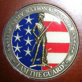 THE MEDAL OR MEDALLION ONE ON THE LEFT WITH THE FLAG EMBLEM ON IT HAS THE FOLLOWING STAMPED ON IT: ARMY NATIONAL GUARD / I AM THE GUARD THE MEDAL OR MEDALLION ON THE RIGHT HAS THE FOLLOWING STAMPED ON IT: WE WILL NOT WAIVER, WE WILL NOT TIRE, WE WILL NOT FALTER, AND WE WILL NOT FALL / ARMY NATIONAL GUARD ON THE BRASS OR BRONZE PLAQUE THE FOLLOWING IS STAMPED: AMERICAN SOLDIER THIS FLAG IS PRESENTED TO A TRUE AMERICAN HERO IN RECOGNITION FOR YOUR SERVICE AND SACRIFICE IN THE CAUSE OF FREEDOM. YOUR SERVICE WILL NEVER BE FORGOTTEN . FROM THE GRATEFUL PEOPLE OF THIS NATION. ARMY NATIONAL GUARD CITIZEN / SOLIDER / HERO