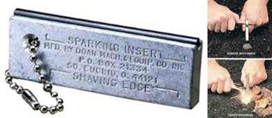 mit Feuerstein. Zum feuermachen wird mit dem Messer eine kleine Menge Späne abgekratzt und durch Funkenschlag vom Feuerstein entzündet. So kann mit wenig Übung fast überall ein Feuer entzündet werden. Gehört seit Jahren zur Überlebensausrüstung der US-AIR-FORCE und anderen Einheiten. Sehr geringes Gewicht. Sehr ergiebig. Temp. 5400 Fahrenheit = 2982 C daher kein Spielzeug.