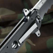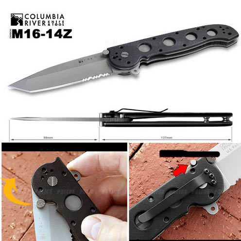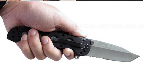 Klappmesser für Einhandöffnung mit der Flipper Aid-Oeffnung. Gesammt Länge geschlossen: 13,5cm. Klingenlänge: 10cm Klingendicke 3,5mm Tantoform mit 1/2 Wellenschliff. AUS 6M Klinge mit 55-57 HRC = Rockwell Härte, mit nicht reflektierendem Finish. Rassiermesserscharf geschliffen. Griff: ebenfalls aus rostfreiem Stahl mit schwarzen Zytel Griffschalen und schwarzem Gürtelclip. Gewicht: 176 Gr. Gemacht für den härtesten Einsatz. Dieses Messer verfügt schon über die neue, zusätzliche Klingensicherung. Columbia Rivers U.S. Pat. No. 5.596.808 Spezial Preis