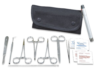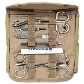Notfallbesteck für Sanitäter. Falttasche mit Pinzetten, Scheren, Klemmen, Skalpell, Nahtmaterial, Lämpchen und Alkoholtupfer. Kann individuell aufgerüstet werden. Cordura Tasche mit Molle Bänderung.