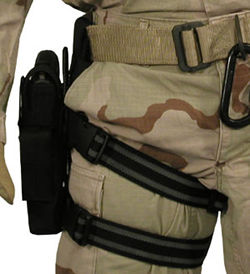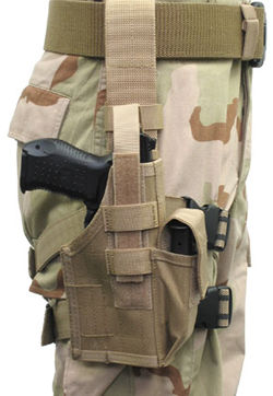 Tactical Assault Holster Omega VI 370 Gr. Taktisches Oberschenkelholster mit aufgesetzter Magazintasche. Durch das Sicherungsband mit Druckknopf kann die Waffe Blitzschnell gezogen werden. Dieses Sicherungsband wird wiederum durch ein Klettband gesichert, welches erst kurz vor dem Einsatz geöffnet wird. Dadurch wird verhindert, das der Druckknof im Einsatz unbeabsichtigt aufspringt.