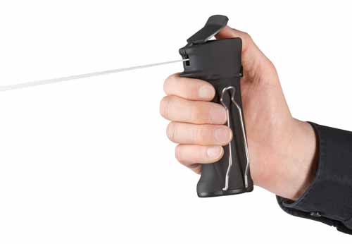 Pfeffer im Anschlag auf Kopfhöhe, bis 110cm lang. Wenn die Situation ändert, das Spray losgelassen und sofort sind wieder beide Hände frei zum zupacken. Der Pfeffer hängt sicher ausserhalb des Handgemenges am Kabel, nahe dem Körper, ca. 30cm