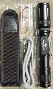 Grösse: 153mm Lang und 22.8mm Durchmesser. Gewicht: 72 Gramm ohne Batterien. Inkl. Zubehör: Gürteltasche, Handschlaufe, MetallClip, Ersatz O-Ringe und Leuchtknopf.