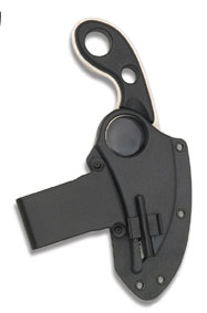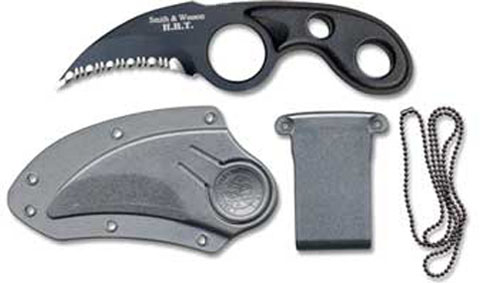 Neck Knife komplett aus 4034 Stainless Stahl mit schwarzer Teflon Beschichtung. Die gebogene Klinge mit scharfem Wellenschliff. Griff-Schalen aus Zytel-Kunststoff