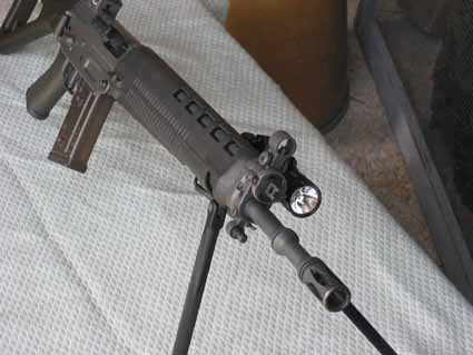 Stgw 90 und 90 PE oberer Handschutz mit Weaverschiene und Art. 00736 Tac-Star 2000 Weapon Light. Die Lampe ist mit 2 St. ZF Ringen fachgerecht montiert, so das diese parallel zur Laufachse lieget und eine schnelle Zielerfassung im Schein der Lampe ermöglicht wird. Die Montage der Ringe verfügt über besonders Grosse Schraubköpfe, welche ein entfernen der Lampe ohne Werkzeug ermöglichen. (Ringe bleiben an der Lampe.) Dieser Handschutz kann einfach und schnell gegen den Original gewechselt werden, somit ist an der Waffe keine Aenderung nötig. Montage kann wahlweise links oder rechts erfolgen. Die Bedienung der Lampe erfolgt über den Kabelendschalter welcher mit Klett-Teilen ebenfalls am Vorderschaft befestigt wird. Die Klett-Teile werden lose geliefert, da diese individuell an der günstigsten Position festgeklebt werden. Ca. 65 Lumen Lichtkraft, inkl. Batterien. Fertig montiert.
