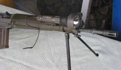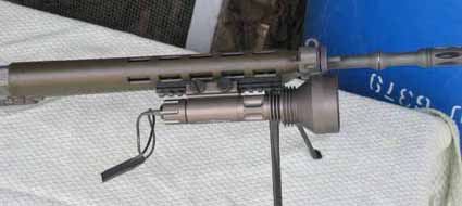 Vorderschaft mit Weaver Schiene und Art. 02768 SURE-FIRE M-3 Millenium Tac- Light mit Turbokopf und Kabelendschalter. Diese Lampe verfügt im Mittelteil um eine Weaver-Aufnahme mit grossen Schraubköpfen. Geliefert mit MN15 Brenner 125 Lumen. Aufrüstbar mit MN16 Brenner 224 Lumen Leuchtkraft je nach Witterung -190 Meter Kletteil zur befestigung des Kabels liegen lose bei und müsen selber an der gewünschten Stelle geklebt werden.