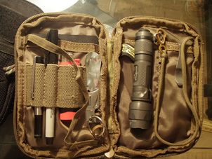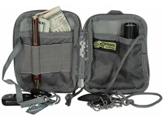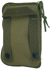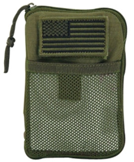 Molle Tasche mit rundum Reissverschluss Oeffnung, aufgesetztem Netzfach und Nat Abz. Innen unterteil und mit Schreibzeug Fächer, Steckfach und 2 Bänder mit Karabiner zum sichern von Messer, Tool ect. HxBxT 14x11x2 cm