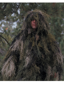 Synthetisches Tarnmaterial befestigt auf 18mm Netzgewebe. Kaputzenjacke mit Reissverschluss, Kordelzug und elast. Aermelabschlüssen. Hosen mit elast. Knöchelabschlüssen u Kordelzug in Hüfte. Feuer-, Wasser- u UV resistent. Zusätzlich antiallergisch behandelt und Handwaschbar.