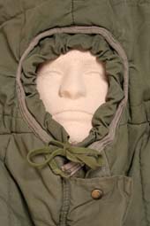 Blended polyester fiber and cotton or down fill Water-repellent poplin cotton lining 3" snap closure storm flap Offset stitching seals the seams 64" long zippers Drawcord hood Wide roll-up loops 84" overall, 30" wide at top and 14" at bottom. Weight: About 7 lbs.