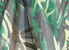 Camouflage Mesh Fabric in a Woodland camo print. Lightweight mesh, good for things like insect netting, blinds, mesh inserts in clothing, and linings. 50" wide