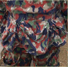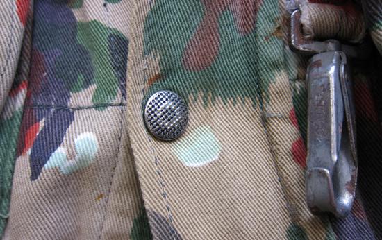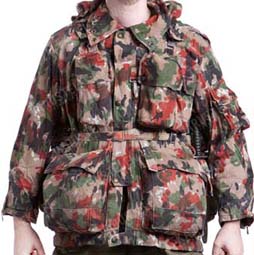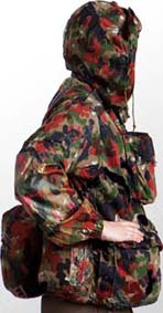 Die Kampfjacke hatt 4 Taschen für je 2 57er Mag. Total 8 Mag. Des Stgw 57. Weitere Taschen für Gamelle, Feldflasche, Gasmaske, Pellerine usw. Frontreissverschl. mit breitem Druckknopfflapp. Kragen hochgestellt mit 3 Druckknöpfen schliessbar. Karabiner zum Anhängen des Stahlhelmes. Metall O-Ringe für Kampfrucksack und eine grosse schnürbare Kaputze mit Netz zur Gesichtestarnung. Zwei Bänder Innen vorne konnte mit den Hosen verbunden werden. Doppelter Rückenteil für Ersatzwäsche, polsterte dadurch auch gleich den Rucksack. Genügend Möglichkeiten zum befestigen von Leinen um Messer, Lampe usw. vor Verlust zu sichern. Plastifizierte Ellbogen schützen vor Nässe, sei es beim Kriechen, Roppen oder in der Stellung. Knöpfbare Gurtschlaufen in der Hüfte.