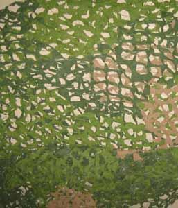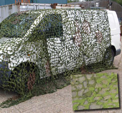 Militärisch Stabiles Netzgewebe als Grundmaterial mit eingearbeitetem Laubwerk, ähnlich den Schweizer Tarnnetzen.