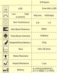 Cree XM-L LED mit 420 Lumen Leuchtweite bis zu 200 Meter 420 Lumen 1 Std. oder 80 Lumen während 5,8 Std. Inklusive 2x CR123A Batterien Masse (mm) 140 x 39.2 x 25.4 (Länge x Kopf-Durchmesser x Körper-Durchmesser) Netto Gewicht 127 Gramm