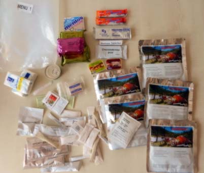 1x Vitaminbrausetabletten 4,5 g 1x Tee-Extrakt 1,2 g 2x Kaffee-Extrakt 3,5 g 1x Kaffeeweisser 3 g 2x Zucker 12,5 g 1x Salz 3 g 1x Kunststoffbeutel 1x Brief Streichhölzer 2x Blatt Mehrzweckpapier 2x Streifen Wasseraufbereitungstabletten