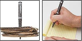 Geschlossen = Kubotan, geöffnet ein Kugelschreiber. (Handelübliche Grossmine) Der geschraubte Deckel lässt sich auch hinten aufschrauben.