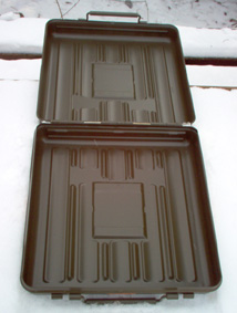 Stahlblech Kanister mit 2 Spannverschlüssen und Tragbügel oben. Zu tragen wie kleinen Koffer. Scharniere sind wie Füsse zum stehend lagern. Seitliche Vertiefung für Inventar Karte. 33 x 31 x 9 cm Aussen 29 x 29 x 7,5 Innen Gut verschlossen, kann selber mit Gummidichtung Wasserdicht gemacht werden. Gewicht nur 2,3 Kg.