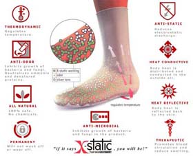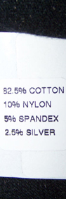 82.5% COTTON, 10% NYLON, 5% SPANDEX, 2.5% X-STATIC* X-Static is a silver-coated textile fiber utilized by the Department of Defense for its anti-odor, antimicrobial and therapeutic properties. M= bis Gr.9, L = bis Gr.12